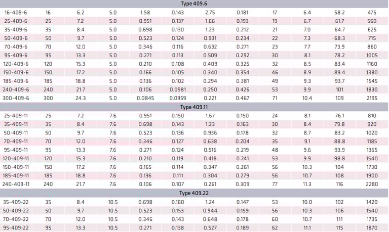 3 Ω/100 m for power cores to 35 mm².