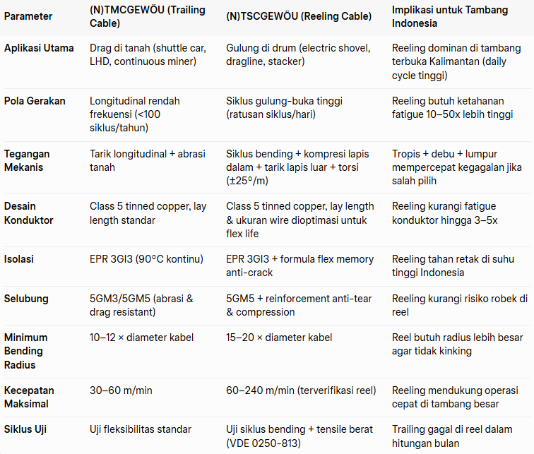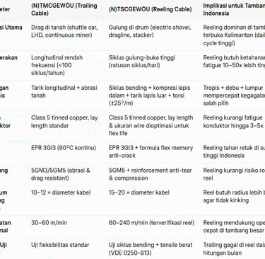 Bolehkah kabel trailing (N)TMCGEWÖU digunakan pada sistem reeling di tambang batubara Indonesia? Analisis teknis mendalam (N)TMCGEWÖU vs (N)TSCGEWÖU: aplikasi, pola gerakan, tegangan mekanis, desain konduktor, serta studi kasus nyata Kalimantan dan Sumatra. Panduan praktis untuk pengadaan kabel yang hemat biaya dan aman.