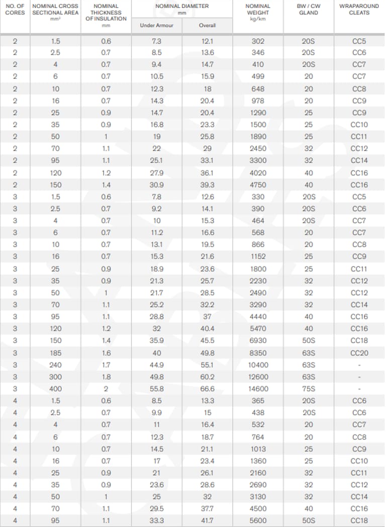 Application | Multi-core PVC cable with steel wire armour (SWA). Power and auxiliary fixed wiring cables for use in power networks, underground, outdoor and indoor applications, and for use in cable ducting. |