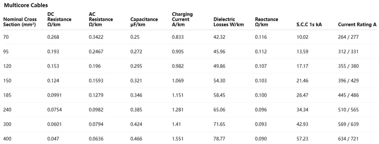 Nominal Cross Section (mm²) | DC Resistance Ω/km | AC Resistance Ω/km | Max. Conductor Temp. °C | Capacitance µF/km | Charging Current A/km | Dielectric Losses W/km | Reactance Ω/km | S.C.C 1s kA | Current Rating A |