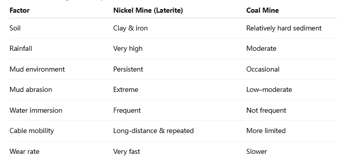 Learn why Indonesian nickel mines — especially Weda Bay — require flexible mining cables with much higher mud abrasion resistance compared to coal mines.