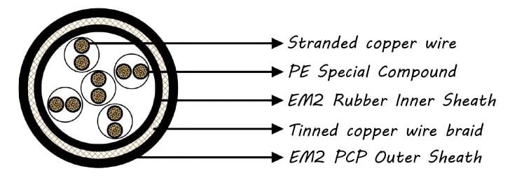 Jacket: Dual‑layer CM type EM2 (chlorinated polyethylene). Resistant to oil, acids, alkali, UV, and chemical corrosion.