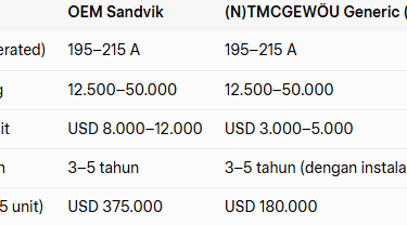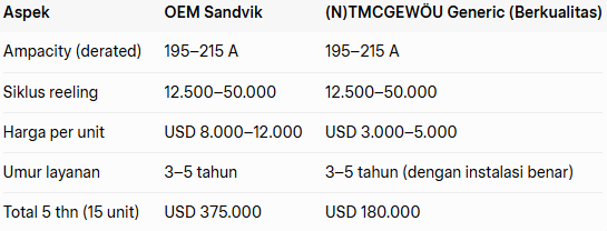 Generic berkualitas: USD 3.000–5.000 (cable + termination + freight). Contoh perhitungan 15 unit LHD selama 5 tahun (2,5 kali penggantian per unit): OEM total ≈ USD 375.000 → Generic ≈ USD 180.000 → Penghematan USD 195.000 (52%). Dana ini dapat dialokasikan untuk maintenance, training, atau upgrade AutoMine®.