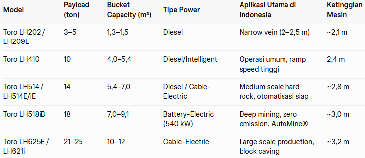 Berikut adalah model Toro™ series yang paling populer dan sesuai kondisi Indonesia (berdasarkan spesifikasi resmi Sandvik dan pengalaman lapangan):