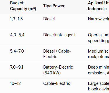 Daya listrik atau baterai: Model kabel-electric (seperti LH514E) dan battery-electric (LH518iB) menghilangkan emisi diesel bawah tanah, mengurangi kebutuhan ventilasi hingga 30–40%, serta menurunkan kebisingan dan getaran.