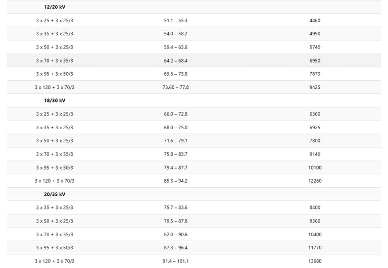 4,2/7,2 kV · 6,9/12 kV · 10,4/18 kV · 13,9/24 kV · 20,8/36 kVJARI-JARI TEKUK MINIMUM