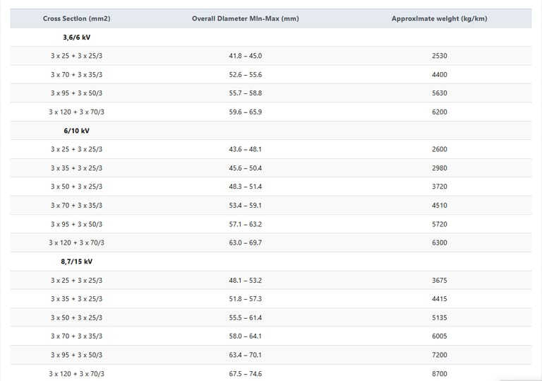 Kabel NTSCGEWÖU tersedia dalam berbagai penampang konduktor dari 25 mm² hingga 120 mm², dengan kombinasi 3 core daya + 3 core kontrol.