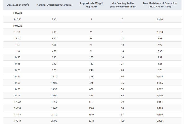 Radius lentur minimum tercantum di spesifikasi teknis, misalnya 6 mm untuk H05Z-K 1×0,5 mm² dan hingga 100 mm untuk H07Z-K 1×240 mm². Pastikan saat instalasi tidak melampaui radius ini untuk menghindari kerusakan kabel.