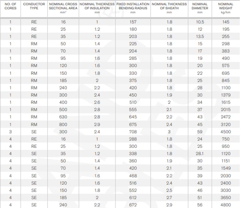 Kabel ini menggunakan aluminium sebagai konduktor utama, tersedia dalam beberapa tipe: