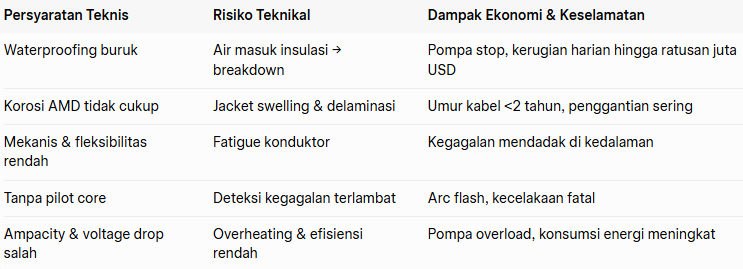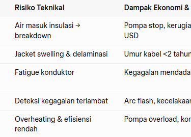 Alasan: Pada kedalaman 500 m, tekanan hidrostatik mencapai 50 bar yang akan menekan insulasi dan menciptakan void serta partial discharge. Suhu tropis dan siklus basah-kering mempercepat difusi air. Teknologi water-blocking mengurangi laju penetrasi hingga 10–100 kali, mencegah short-circuit yang berakibat pompa berhenti mendadak.