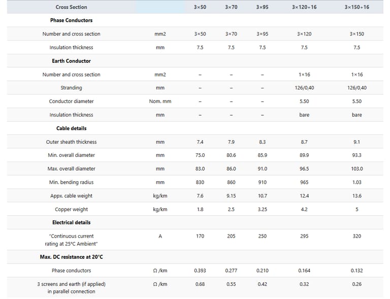 Fleksibilitas Tinggi: Min. bending radius hingga 1.03 m untuk kabel 3×150+16 mm², memudahkan pemasangan di area terbatas.