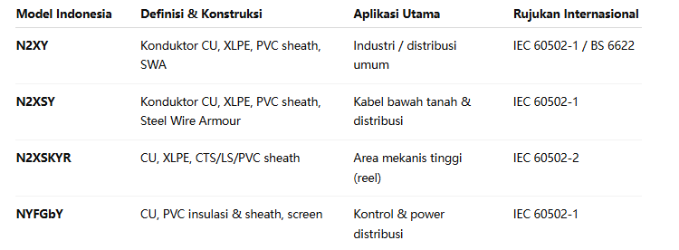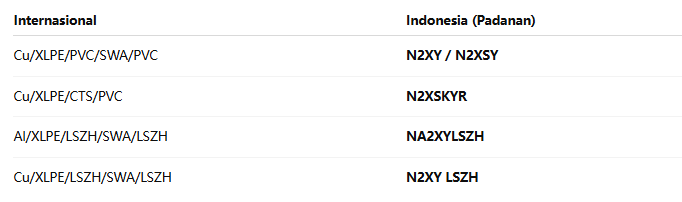 Model kabel seperti N2XY, N2XSY, N2XSKYR, NYFGbY di pasar Indonesia sejatinya merupakan padanan dari standar internasional IEC/BS, hanya berbeda di nomenklatur. Namun secara teknis memiliki fungsi, performa, dan kriteria yang setara.