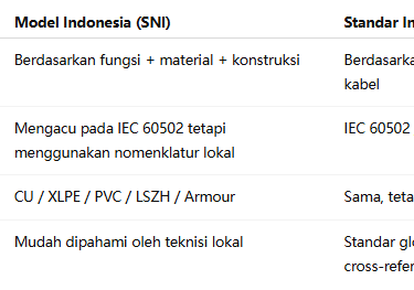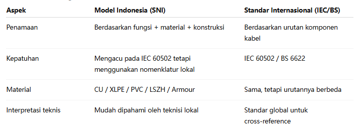Standar SNI Indonesia sepenuhnya kompatibel dengan IEC → artinya kabel Indonesia dengan model SNI tetap dapat di‑cross‑reference ke standar internasional.