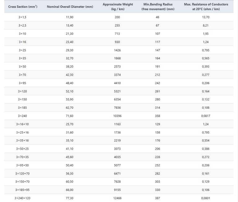 Kapasitas arus konduktor mengikuti standar VDE 0298-4 Tabel 11, sehingga aman untuk beban mekanik dan listrik pada crane atau hoist.