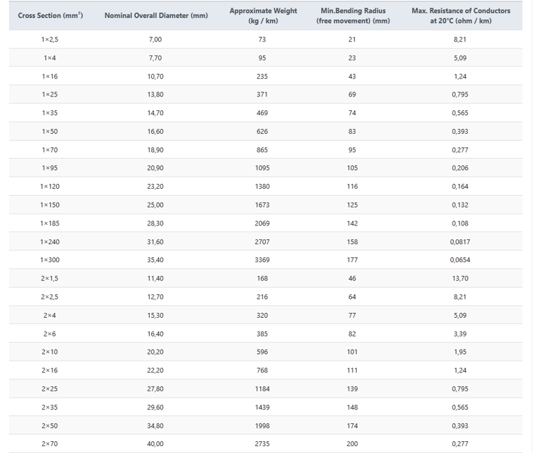 Radius minimum lentur: Sesuai VDE 0298-3 Tab.3