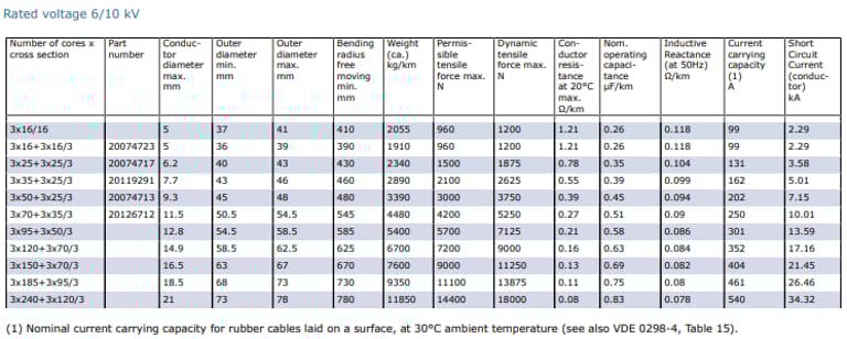 Kabel | Tegangan | Radius Tekuk Min | Torsional Resistance | Kecepatan Maksimal | Catatan |