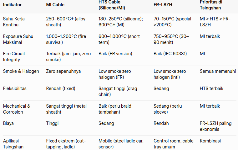Kesimpulan perbandingan: MI Cable adalah “tank” untuk zona paling panas. HTS memberikan keseimbangan fleksibilitas + performa. FR-LSZH adalah pilihan ekonomis untuk safety compliance. Di Tsingshan, strategi terbaik adalah hybrid: MI/HTS di hot zone, FR-LSZH di auxiliary area.